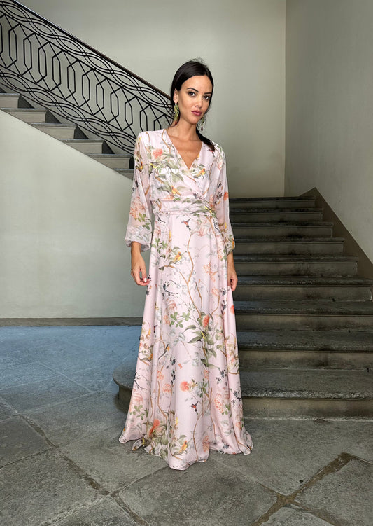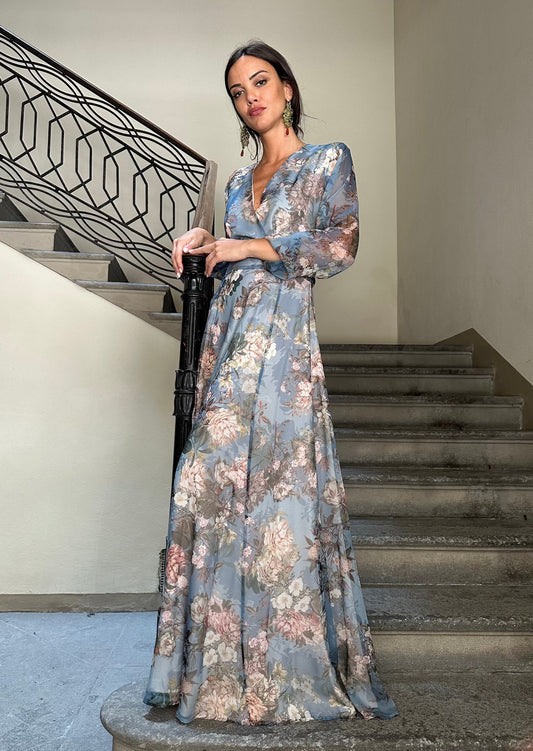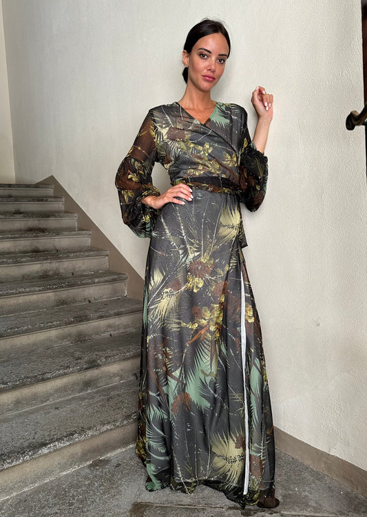 Robe longue décolletée en soie imprimée